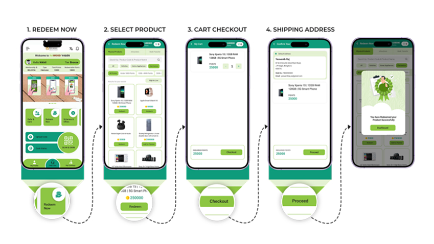 Open the Relwood® Vriddhi app and click on the redemption catalogue. Choose from gifts,